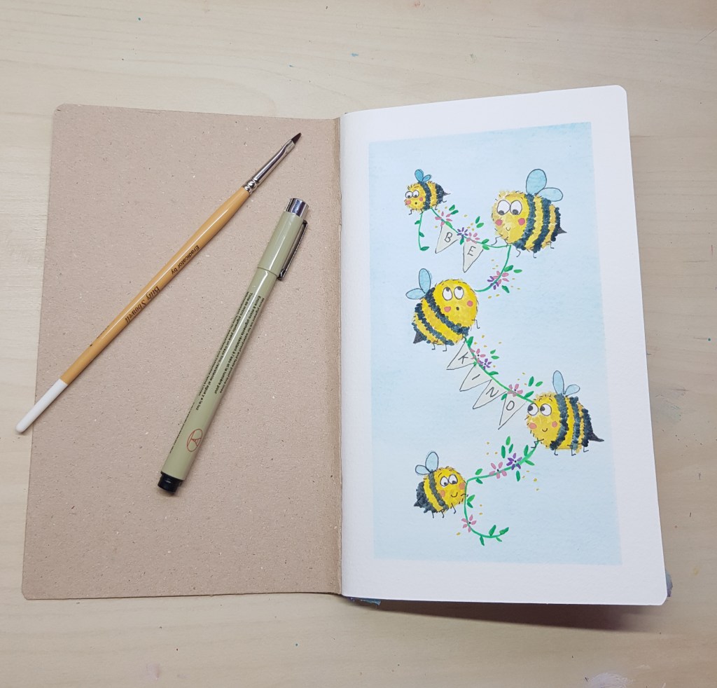 I just wanted to share a few sketchbook pages that I have been working on recently. The next two pages are just little doodles that I drew. I love little bumblebees and just like to paint them because they always look so friendly and happy.